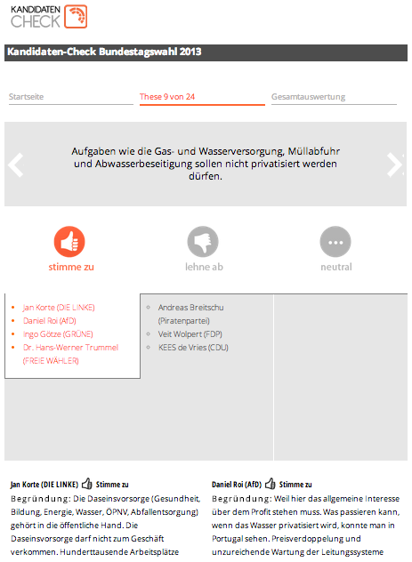 Gerade stelle ich noch fest, dass die Angabe im Kandidatencheck für einen Kandidaten auf »ablehnend« steht, während der dazugehörige Antworttext Zustimmung ausdrückt. Im Profil des Kandidaten sind die Antworten ebenfalls aufgeführt, dort ist auch die Zustimmung zu dieser These festgehalten. Am besten, ich frage mal nach…