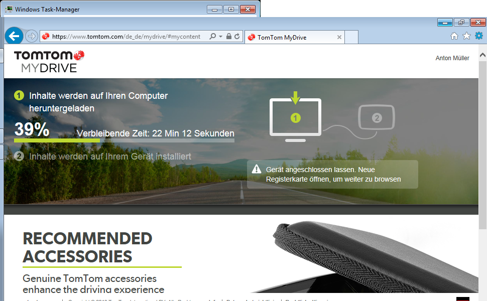 Zum Anlegen des Benutzerkontos wurde die Internetseite von TomTom geöffnet, dies funktionierte noch im Google Chrome. Danach verlangte die GUI, das Gerät zu koppeln, was immer wieder auf die Anmelde- oder Download-Internetseite führte.