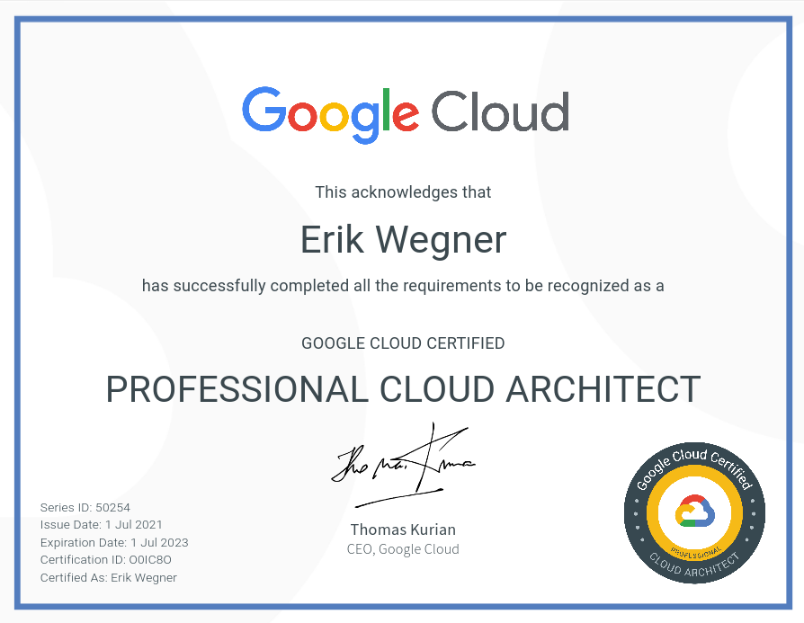 Professional Cloud Architect Aufmacherbild Gespeichert von Erik Wegner am/um Sa., 03.07.2021 - 07:55 Die Prüfung wurde bestanden und Google hat das Ergebnis offiziell bestätigt. Bilder Kommentare Erik Wegner Credential Holder Directory The site https://googlecloudcertified.credential.net/?order=best_match%20DESC&groups=105693 contains a public list of certified persons. Today there are 14.780 persons world wide certified. Antworten So., 23.01.2022 - 11:31 Permalink Neuen Kommentar hinzufügen Persönliches Cloud-Architekt Softwarearchitekt