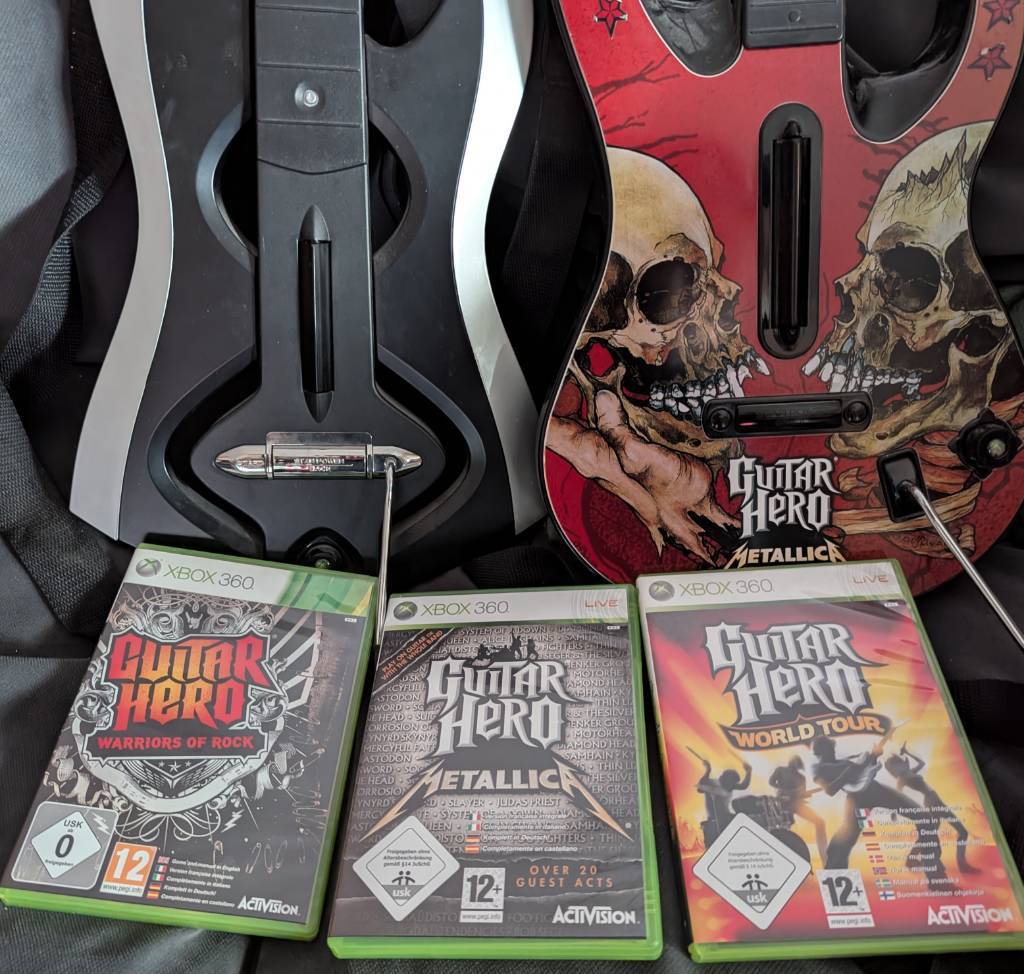 Im Laufe der Zeit haben sich natürlich etliche Spieltitel angesammelt. Besonders erwähnenswert die Reihe Guitar Hero mit den Plastikgitarren.